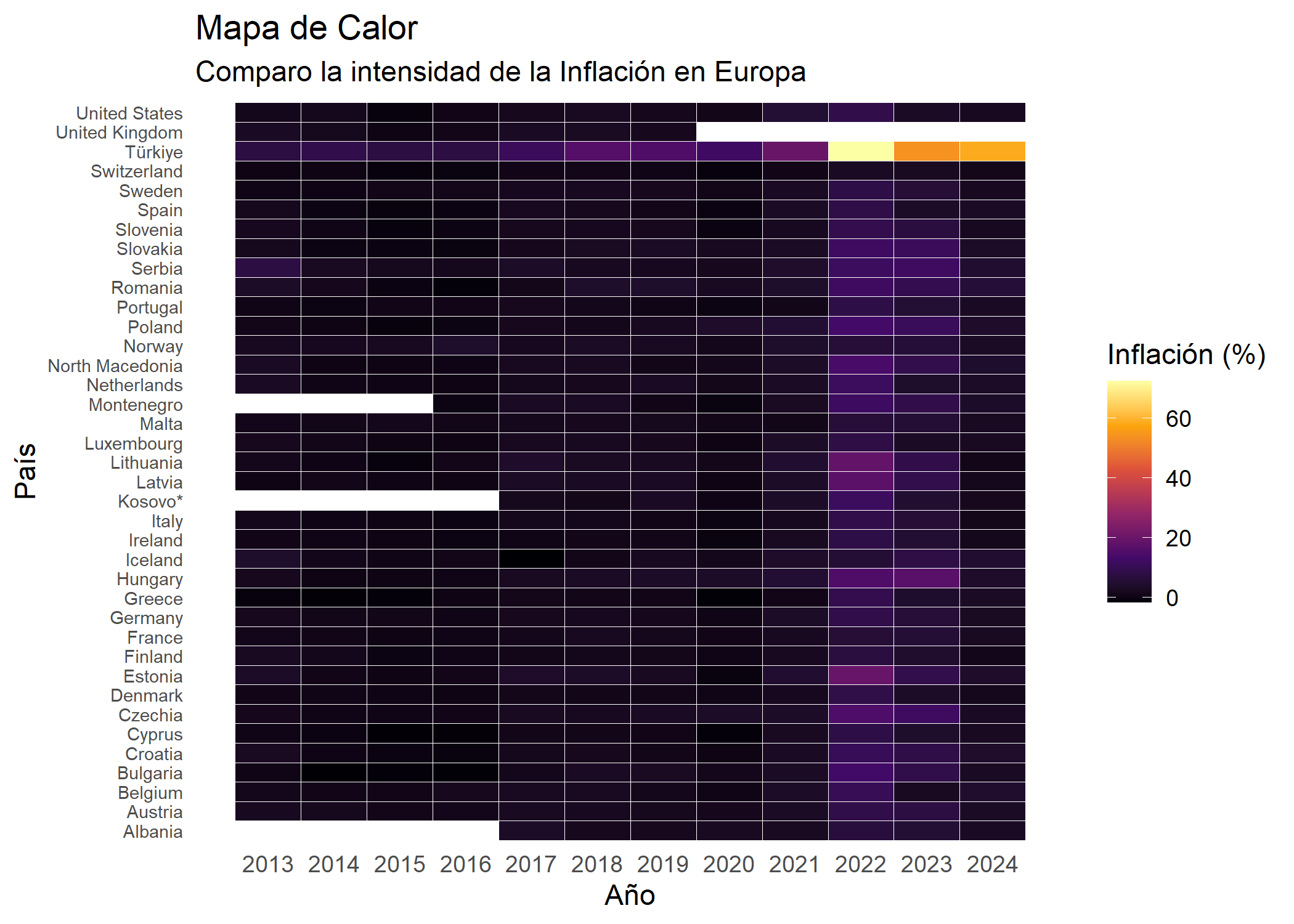 theme(legend.position = "right")De esta forma más visual, con el mapa de coropletas, vemos las zonas donde hay más problemas. Resalta Turquía con una inflación muy elevada, que comparada con la economía europea, llegó a funcionar como un “escudo” que logró mantener los precios mientras fuera se disparaban. (He cogido el 2023 porque se ve más claro y hay más variedad de colores que en el 2024).