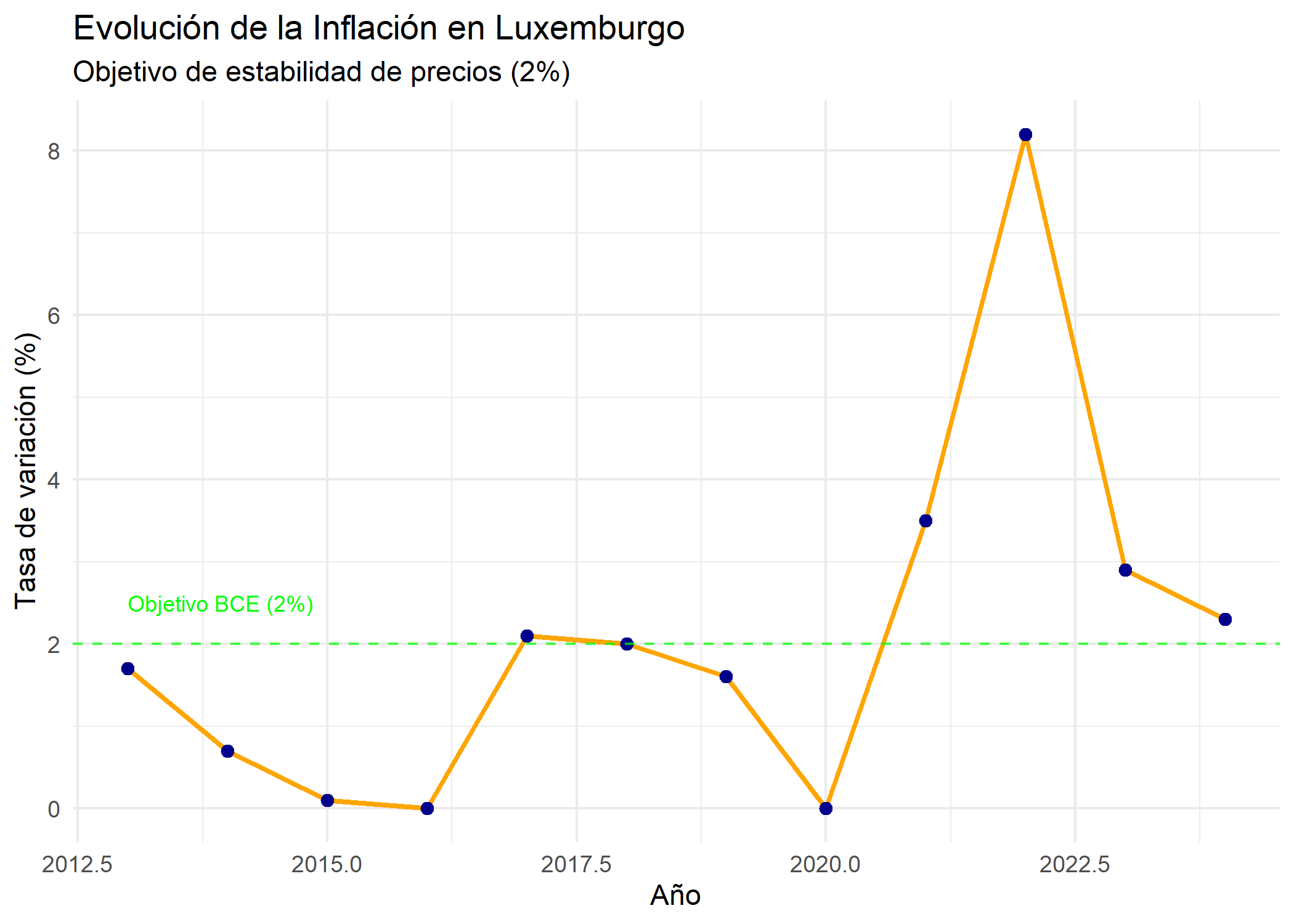 annotate("text", x = min(df_lux$time), y = 2.5, label = "Objetivo BCE (2%)", color = "green", size = 3, hjust = 0) +